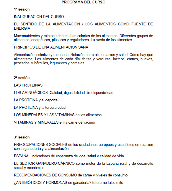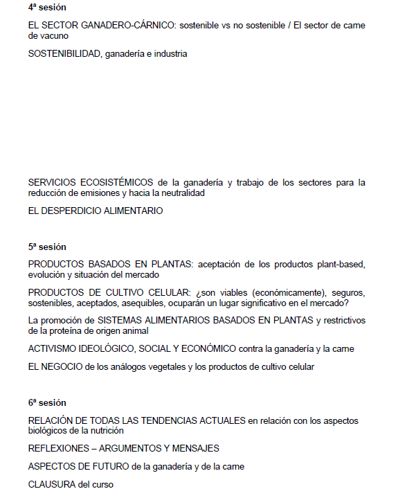 El programa formativo aborda aspectos clave como la nutrición y la salud, el papel de la proteína animal en la alimentación, la sostenibilidad de la actividad ganadera y los retos actuales a los que se enfrenta el sector, incluyendo las corrientes antiganadería y las nuevas tendencias alimentarias.
